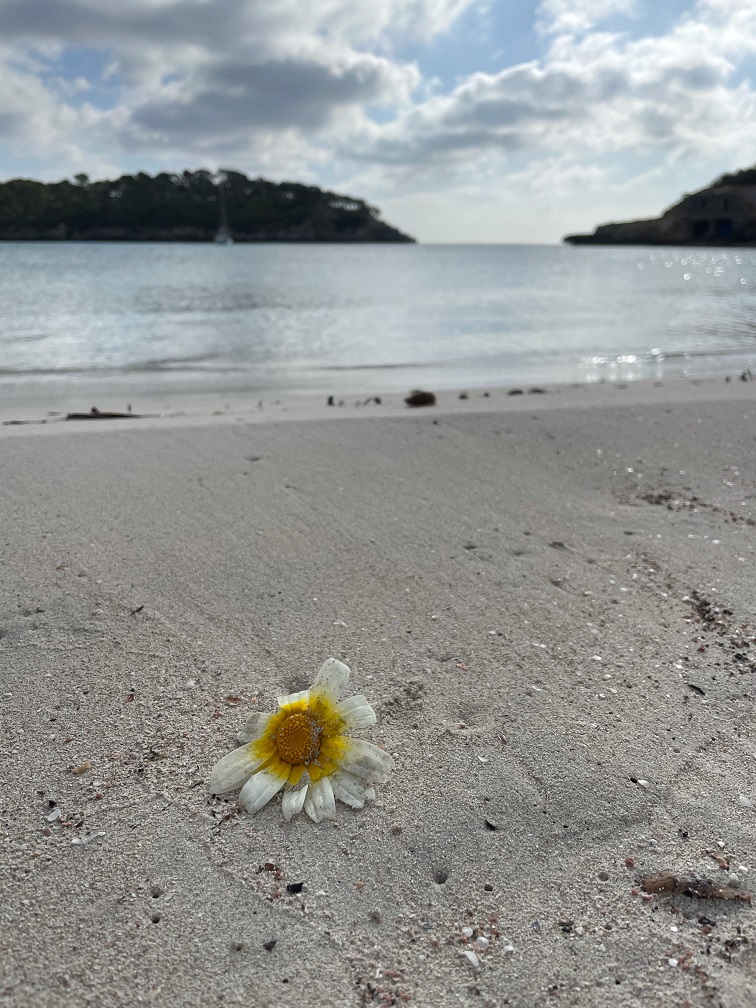 Wir waren heute früh nochmals der Cala Mondragó. Es war ruhig, natürlich und fast unberührt schön. Unsere Blüten, die wir ins Meer zu Julie geworfen hatten, lagen auf dem Sand des Strandes. Wir haben uns auf den Felsvorsprung ganz in der Nähe zu unserem Standort gesetzt, die Erinnerungen an Julie und den gestrigen Tag aufleben lassen und die Kraft des Meeres in uns aufgesaugt. Das tat gut. Hab einen herrlichen Sommer, es war schön, dich kennenzulernen und vielleicht sehen wir uns wieder. Andrea/München
